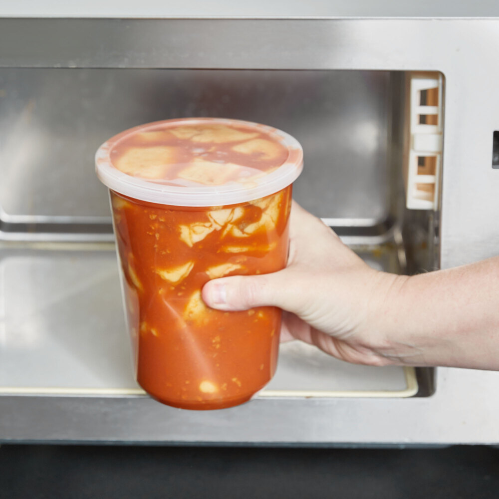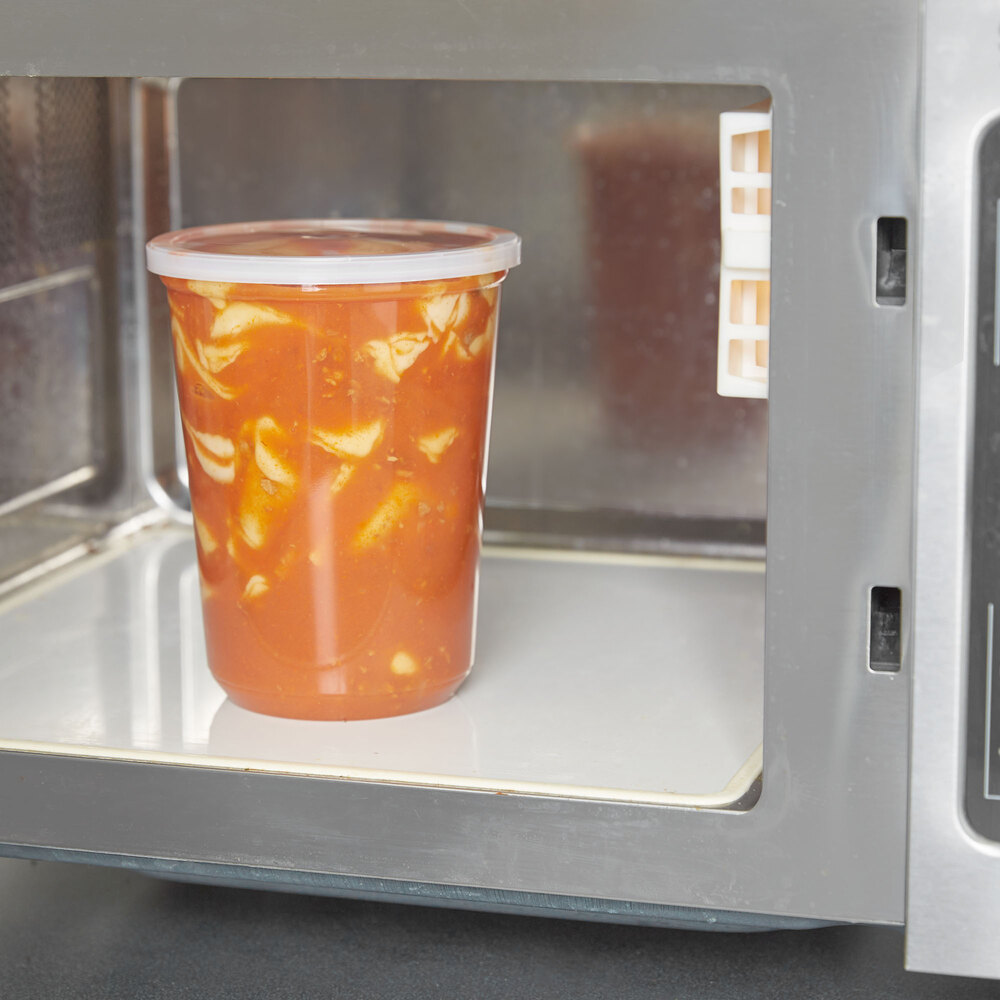 When customers can't get enough of your homemade chicken noodle soup, stews, pasta, and baked beans, let them take it home in this clear deli container! Great for delis, salad bars, or restaurant take-out applications, this container is designed for transporting, storing, and then reheating hot food items. The classic round shape holds up to 32 oz. of your most popular hot and cold foods.