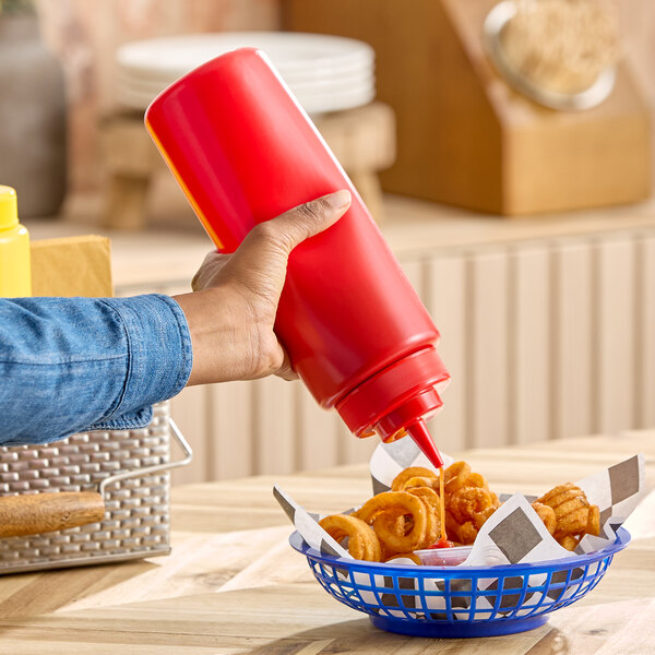 Finish off your signature burgers and french fries with this Choice 32 oz. red wide mouth squeeze bottle.