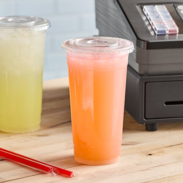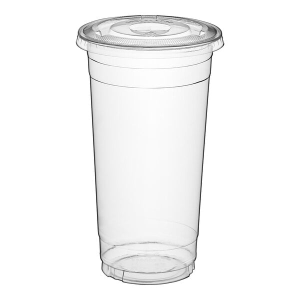 This Choice 32 oz. straight wall clear PET plastic cold cup with flat lid is the perfect way to serve ice cold beverages to your patrons!