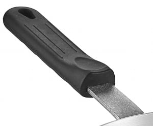 This pan features a sturdy handle that's riveted on, ensuring a very rigid connection between handle and vessel, while guaranteeing longevity even in a commercial kitchen. The ergonomic, black silicone handle is molded to fit your fingers and removable for easy maintenance. It's also heat-resistant up to 450 degrees Fahrenheit to keep it cool for ultimate safety. The handle also has a hanging hole which additionally helps with storage.