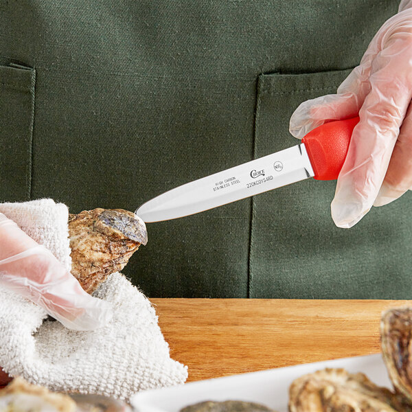 Opening shellfish can be tedious, but this Choice 4" Galveston style oyster knife with red handle is designed to make the process easier. Regardless of your technique or familiarity with oyster shucking, this knife is the perfect tool for beginners and experts alike.