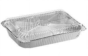Try this Choice Heavy Duty Smoothwall Silver Large Oblong Foil Entree / Take-Out Pan with Dome Lid 65.6 oz. - 50/Case instead! With a heavier-duty construction, this item boasts a 65.6 oz. capacity and a smoothwall design made from puncture-resistant foil material.