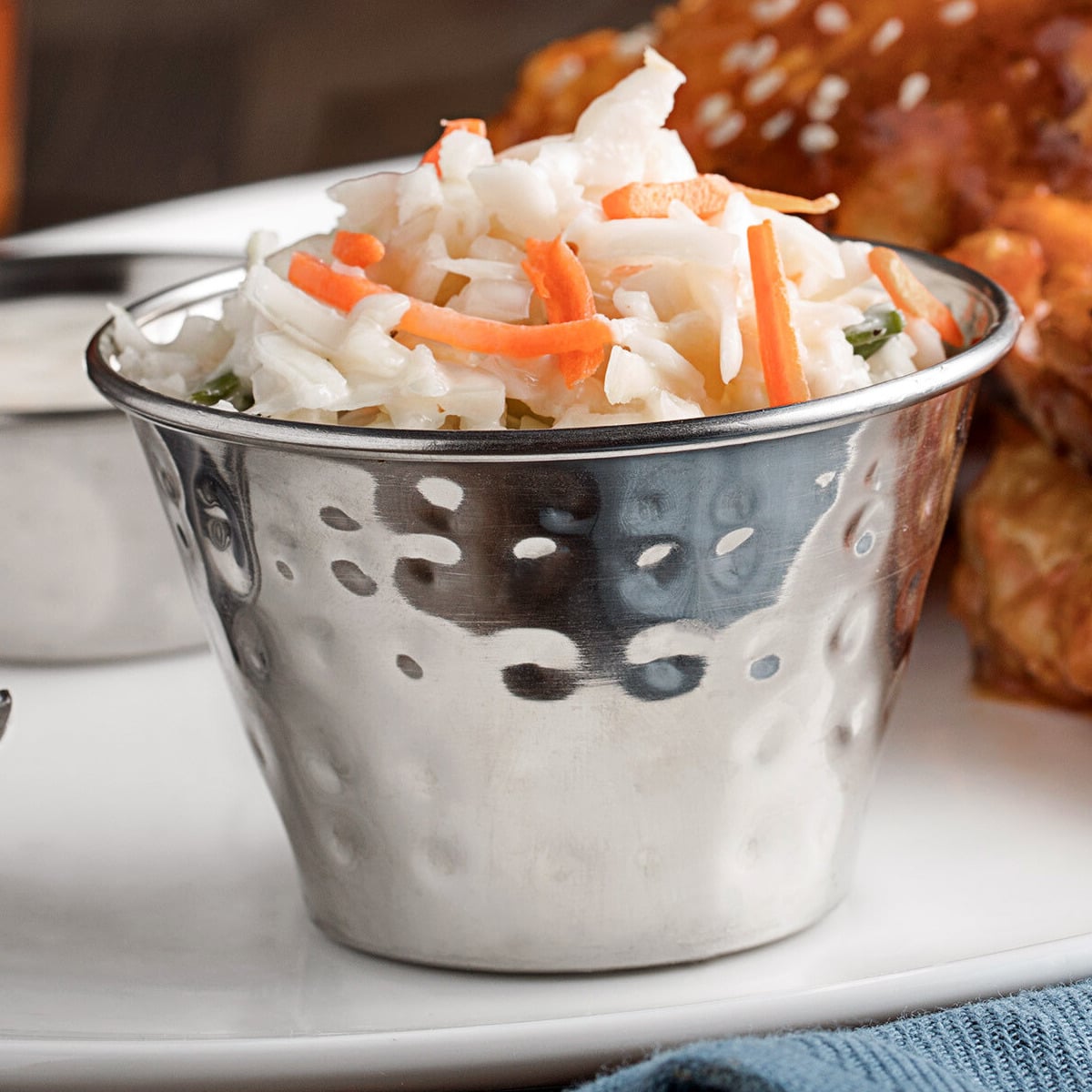 This sauce cup features a hammered design that adds a textured, stylish look to your presentation without taking attention away from your carefully plated foods. Plus, the larger 4 oz. size is excellent for serving additional toppings and sides.