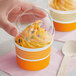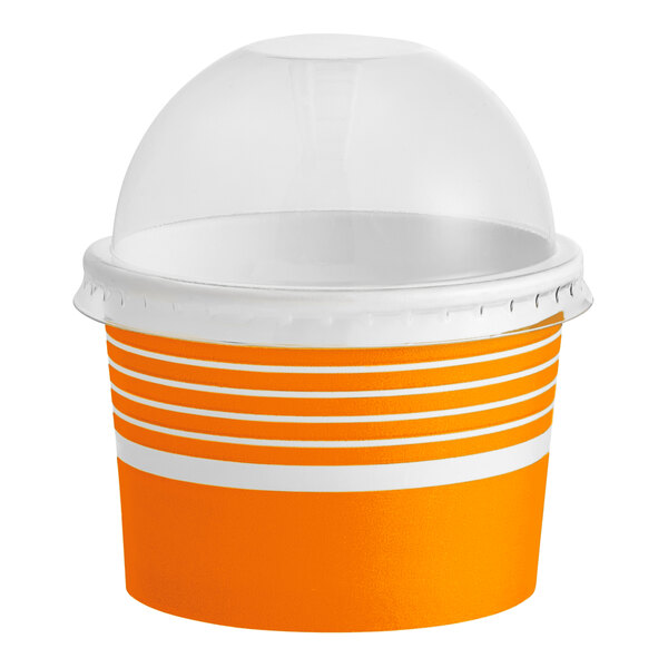 Easily serve a wide variety of to-go treats with this Choice 4 oz. orange paper frozen yogurt / food cup with dome lid! This cup features a sturdy paper construction with a polyethylene-coated interior for excellent leak resistance. Plus, an eye-catching, bright orange color scheme helps add a pop of personality to your take-out offerings.