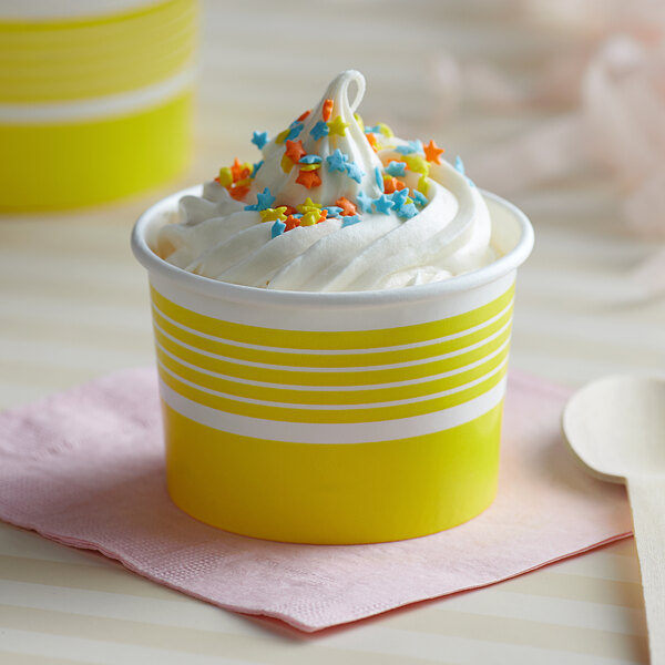 Serve a wide variety of cold and frozen treats with this Choice 4 oz. yellow paper frozen yogurt cup!
