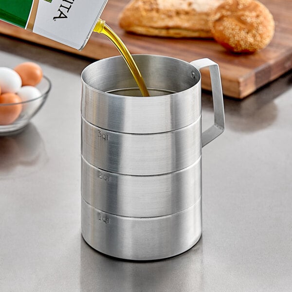 Create convenience in your kitchen using this Choice 4 qt. aluminum measuring cup! Made of durable aluminum, this measuring cup is sure to withstand frequent use. This is the perfect measuring cup for a busy, fast-paced kitchen environment!
