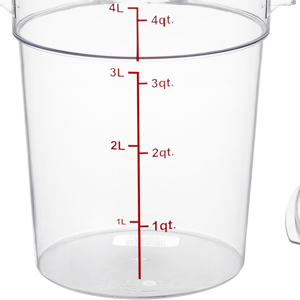 Bold red graduations are printed on the side of the container in both quarts and liters for easy, immediate measuring, saving you time and effort during food preparation. Easily identify and track the date that your food product was made using the reusable "date" indicator at the bottom of the container, or simply adhere a label (sold separately) to the side.
