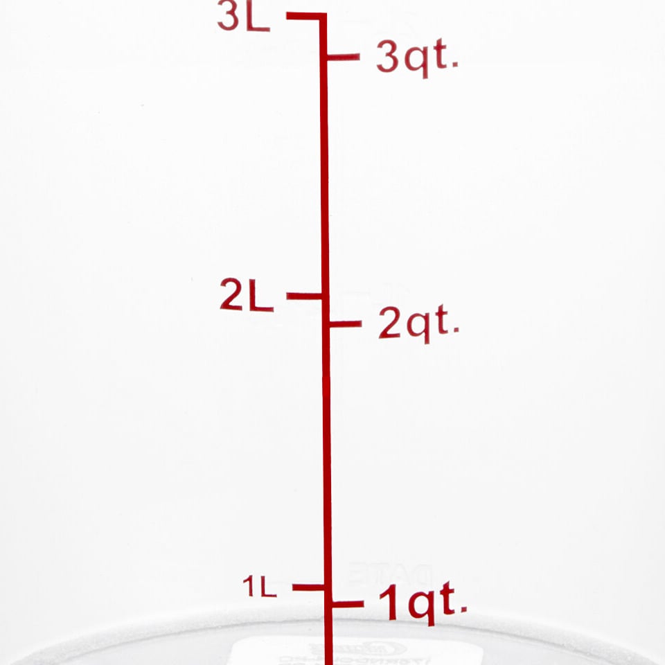 Bold red graduations are printed on the side of the container for easy, immediate measuring. For complete clarity, the measurements are printed in both quarts and liters. You can also easily identify and track the date your food product was made using the reusable "date" indicator at the bottom of the container or simply adhere a label to the side of your container.