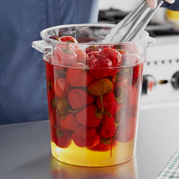 This food storage container is perfect for restaurants, caterers, delis, and cafes. The textured bottom provides durability against scratches and doubles as a non-skid surface, meaning your container won't easily slide around. When paired with a compatible lid (sold separately), it keeps food fresher for longer than when covered with traditional foil or plastic wrap. Use this 4 qt. container to store any ingredient or prepped food in your commercial kitchen.