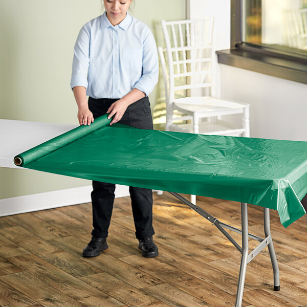 This table cover boasts a vibrant hunter green color to add a stylish touch to any decor and to easily coordinate with other unique decorations to match your event's theme or atmosphere. It comes in a 100' roll to provide you with an ample supply of material, while its 40" width is designed to fit most standard tables. The roll design also makes it easy to cut to size.