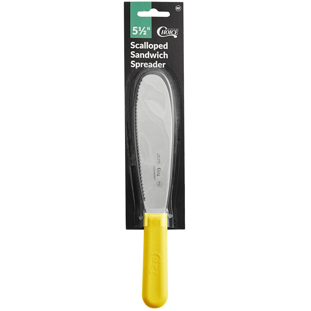 Adding condiments to sandwiches, wraps, and bagels can be done quickly and easily with this Choice 5 1/2" scalloped stainless steel sandwich spreader with yellow polypropylene handle!