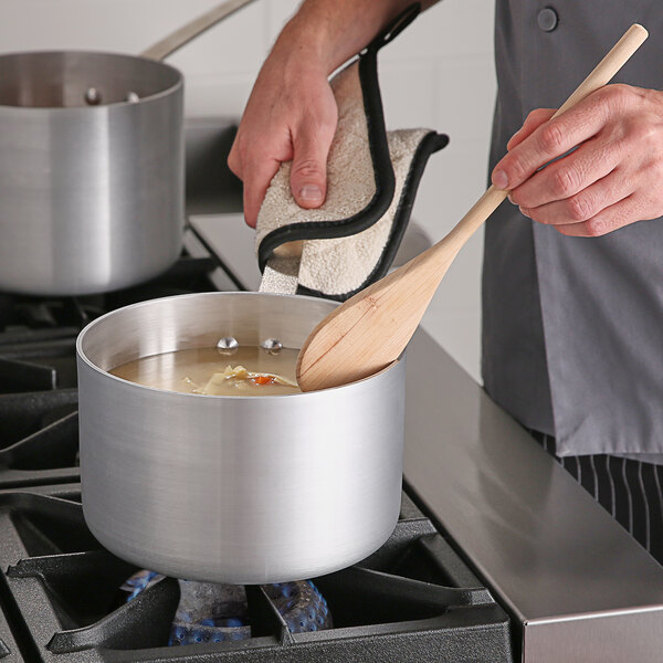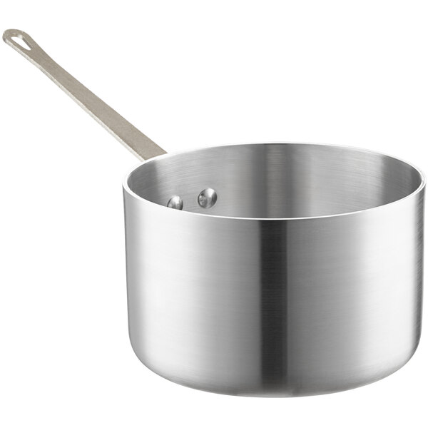 This Choice 5 qt. straight sided heavy-duty aluminum sauce pan offers superior heat distribution and consistency, making it perfect for preparing your house-made soups and sauces, mushroom au jus, gravy, pastas, risotto, oatmeal, custards, and puddings. It's also great for blanching vegetables. With this sauce pan, you'll be able to get the performance your kitchen needs at the price it requires.