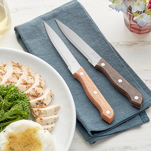 This Choice steak knife features an attractive wood handle that's designed to fit comfortably in hand, making your guests feel right at home. The handle's classic light brown color will create an enhanced presentation for any table setting.