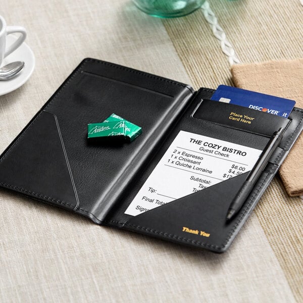 Keep guest checks, server notes, or receipts safe by placing them in this Choice 5" x 9" black vinyl guest check presenter / server book.