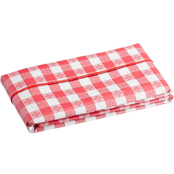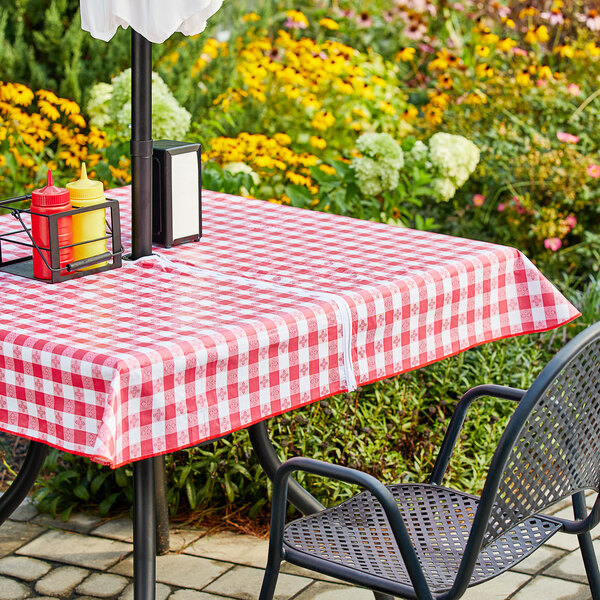Perfect for outdoor decks, poolside cabanas, or casual catered events, this Choice red textured gingham vinyl table cover provides a classic look for any event!