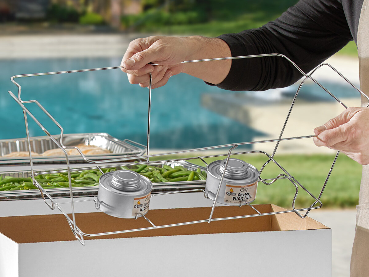 The wire stands each boast a built-in support to securely hold the included fuel canisters, while providing enough room to accommodate the accompanying steam table pans.