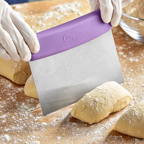 The smooth surface of this dough cutter / bench scraper is also easy to clean, helping you to maintain a sanitary and hygienic food prep area. Additionally, the purple handle allows for a color-coded system to be implemented to assist with preventing cross-contamination. Offering so many options for use, this item will quickly become an essential tool in your busy foodservice operation.