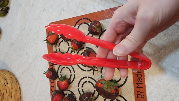I bought these sweet little tongs with my nieces and nephews in mind, knowing that they might have a harder time with larger tongs, and not wanting them to have to resort to using their fingers, I got these Choice 6" polycarbonate scalloped tongs. They are one-piece construction, made of polycarbonate, and are the ideal size for picking up smaller strawberries, candies, cut cantaloupe, and holiday grapes. The red color is festive and they don't look 'cheap', but are inexpensive enough that you need not cry if they get left behind at an event.