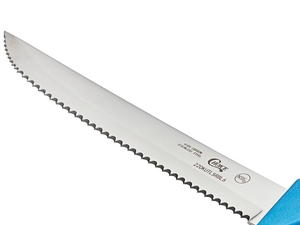 we loved this knife, copping vegetables and fruit is very comfortable. comfortable handle and being green makes to easy to understand our kitchen staff for cross-contamination. serrated edge is makes easier to chop produce.