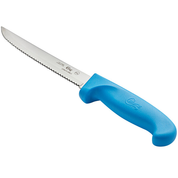 This utility knife is designed for maximum cutting performance and produces sharp, unparalleled cuts each time. Long-lasting, light, and affordable, this Choice knife is ideal for use in any high-volume commercial kitchen, as well as culinary schools and cafeterias. Whether you want to use it to cut fruits, vegetables, or breads, this knife is sure to get the job done. Part of a convenient color-code HACCP line, this knife has a blue colored handle that allows it to stand out and makes it great for creating a color-coded system in your kitchen to prevent cross-contamination.