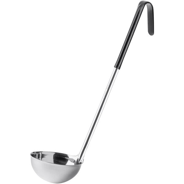 This Choice 6 oz. one-piece stainless steel ladle with black coated handle is the ideal tool for any kitchen.
