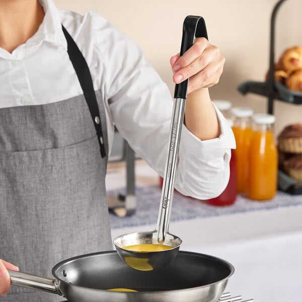 The one-piece construction also makes this item very easy to clean, eliminating lengthy dishwashing processes. This ladle is the ideal complement to any chef's traditional set of utensils. With the capacity stamped in both ounces and milliliters, you can easily identify the ladle you need. In addition, its black PVC handle helps to identify the size of the ladle at a glance for quick service, so you can serve your customers in a timely fashion.