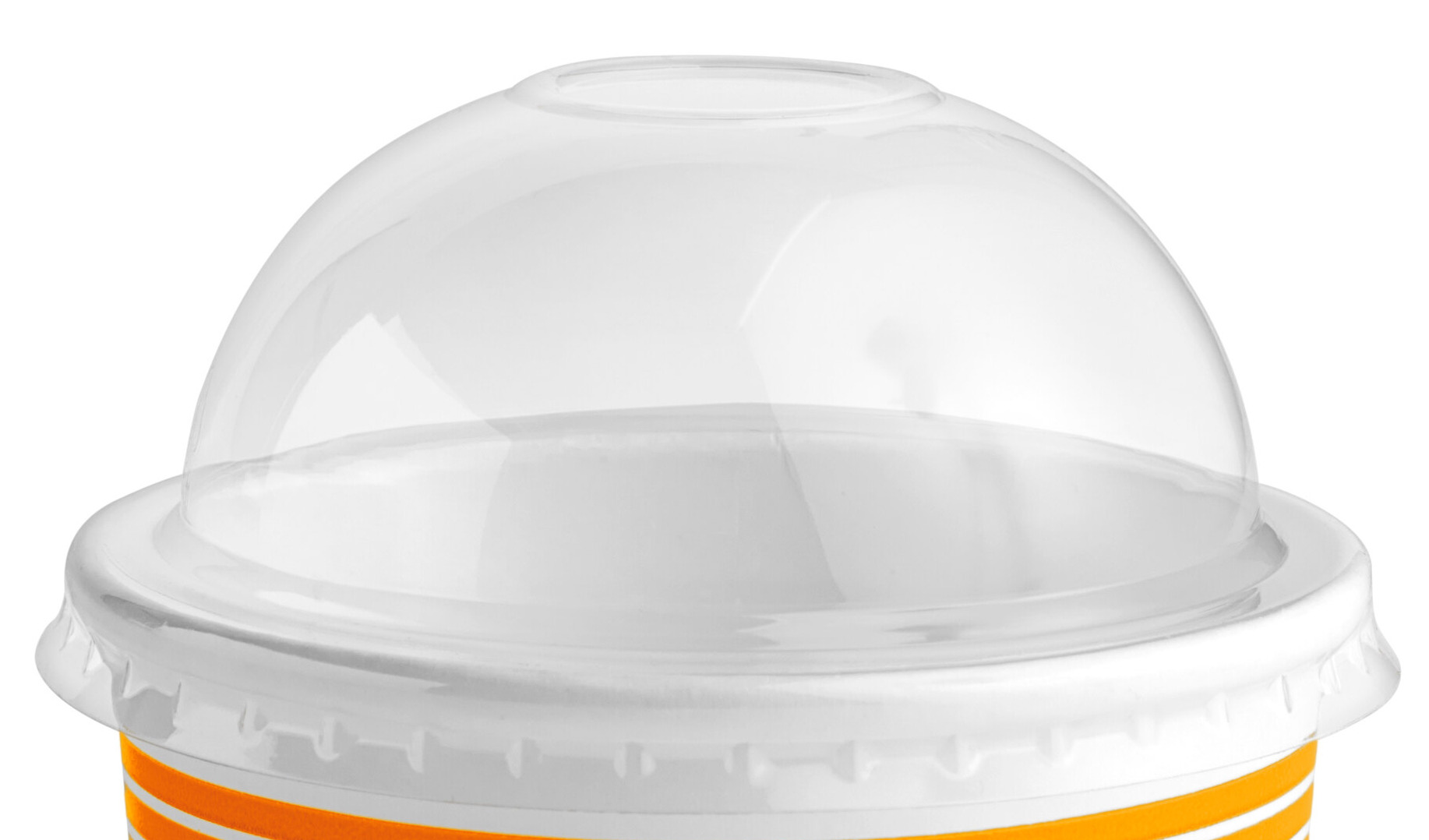 Made from PET plastic, the crack-resistant and leak-proof lid effortlessly snaps onto the cup with a tight seal, helping to prevent messes while being transported. The dome design leaves room for added toppings such as whipped cream and candy crumbles. As an added plus, the lid's clear form allows for fast identification of contents and helps to showcase your delectable items. This cup with dome lid is also disposable for quick and easy cleanup.