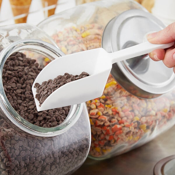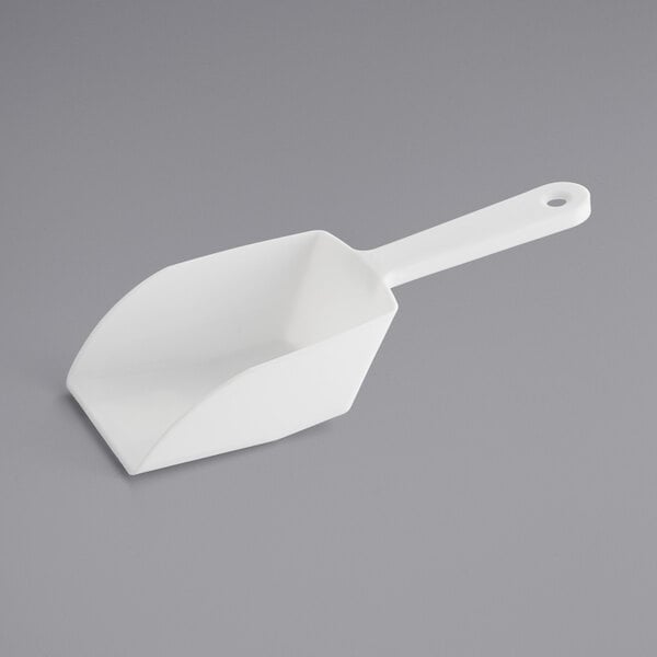 This basic white polypropylene plastic scoop is great for smaller bins of rice/beans/flour, offering a 6oz size. It would likely also be ideal for candy shops or markets where you might want the scoop hanging rather than inside the bin or dispenser, and the flat bottom means it'll hang up nicely. Good product, great price.