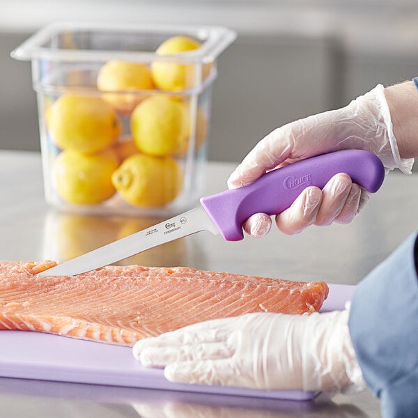 The HACCP purple colored handle helps this knife stand out as being allergen-free. It is also great for creating a color-coded system in your kitchen to prevent cross-contamination.