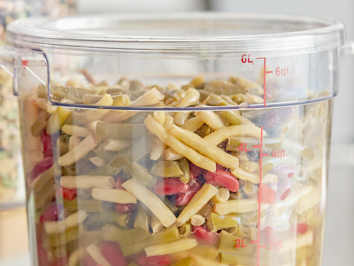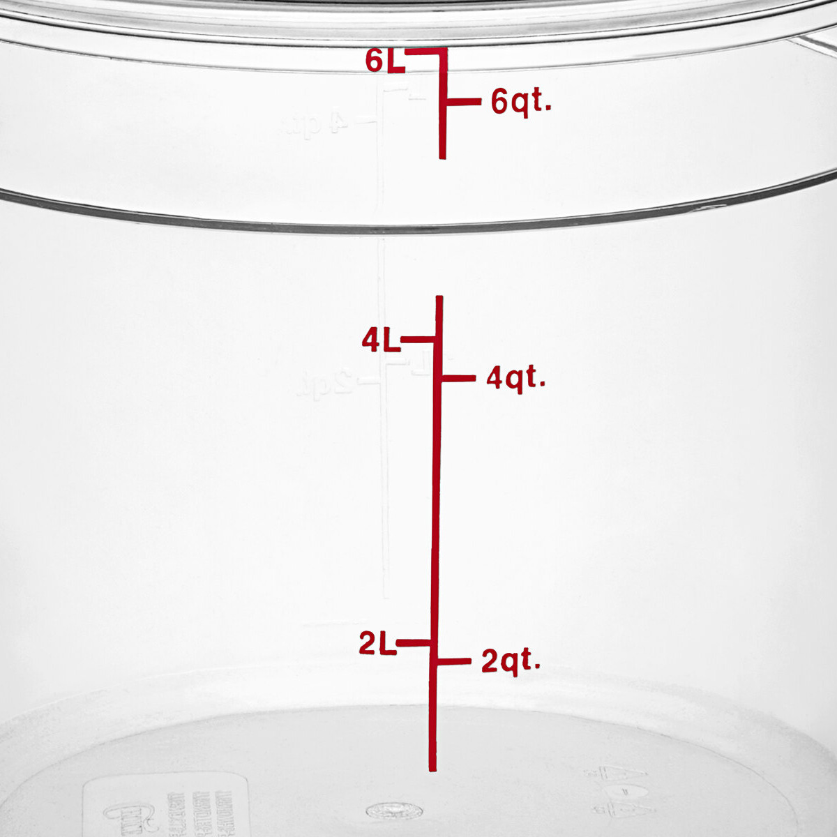Bold red graduations are printed on the side of the container in both quarts and liters for easy, immediate measuring, saving you time and effort during food preparation. Easily identify and track the date that your food product was made using the reusable "date" indicator at the bottom of the container, or simply adhere a label (sold separately) to the side.