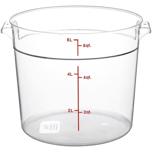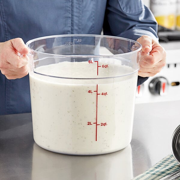 This food storage container is perfect for restaurants, caterers, delis, and cafes. The textured bottom provides durability against scratches and doubles as a non-skid surface, meaning your container won't easily slide around. When paired with a compatible lid (sold separately), it keeps food fresher for longer than when covered with traditional foil or plastic wrap. Use this 6 qt. container to store any ingredient or prepped food in your commercial kitchen.
