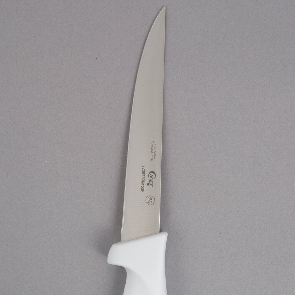 Choice 6" white wide stiff boning knife is sharp. Love the price also quality. Good and Solid and Sharp. I think Choice is good brand for knifes