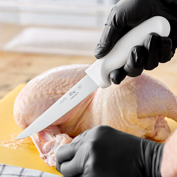 Providing incredibly lean, properly portioned cuts of chicken and pork, this boning knife is a staple for any restaurant, butcher shop, or grocery store.