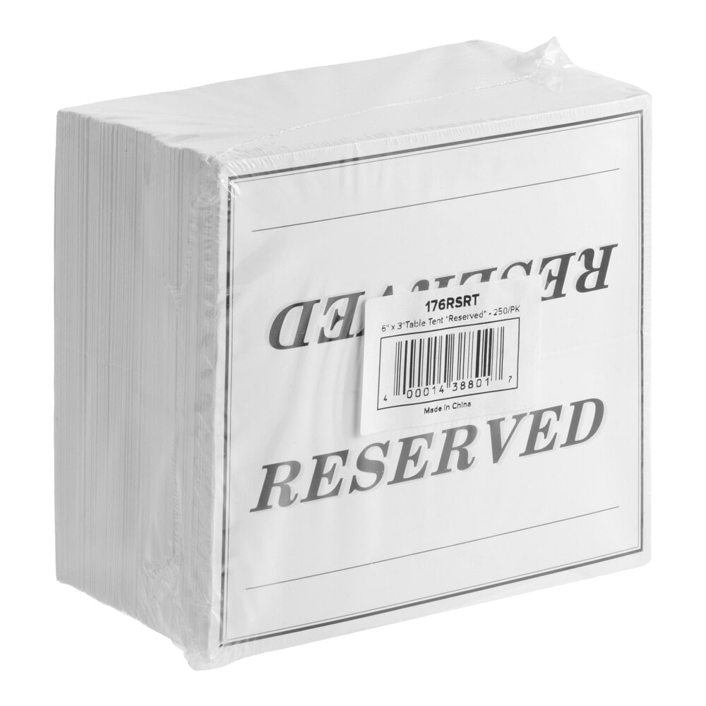 With its large pack size, this "reserved" double-sided sign is easily replaceable in case of stains. In your busy, vibrant environment don't depend solely on verbal cues and memory. Instead, show guests you care with a table tent sign designating their specifically reserved and prepared table.
