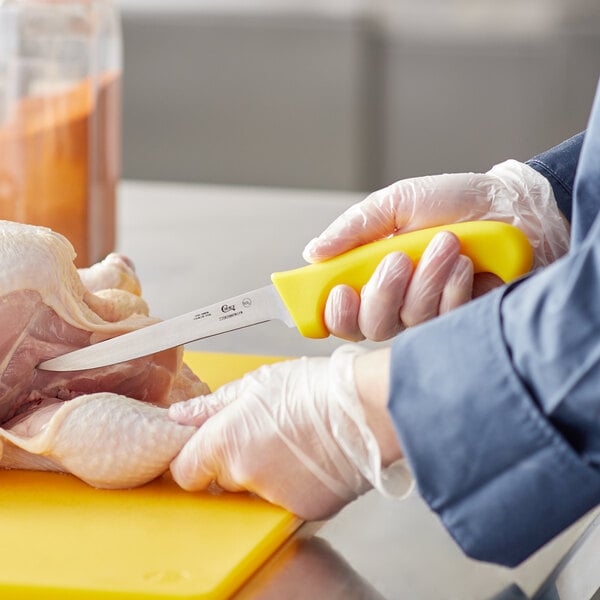 The HACCP yellow colored handle helps this knife stand out. It is also great for creating a color-coded system in your kitchen to prevent cross-contamination.