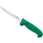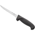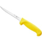 This 6" narrow, stiff boning knife has a ground blade that is highly durable and exceptional at "holding an edge", so it rarely needs sharpening. The special hardening process the blade undergoes results in excellent corrosion resistance and the molded poly handle provides a comfortable, secure grip.