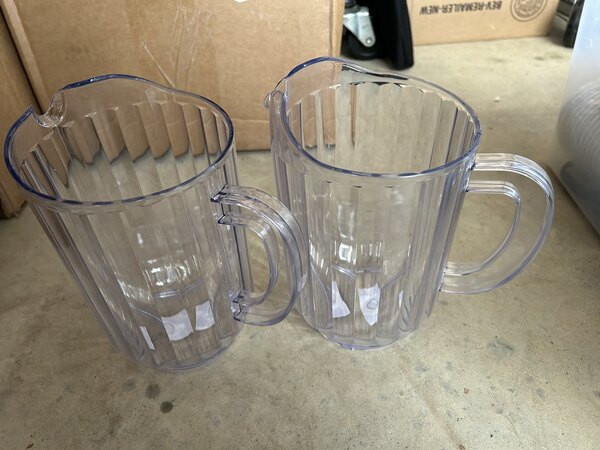 Love the pitchers. Priced right. They withstand the high temp dish machine without fogging the plastic. I use them for Iced Water and Iced Tea on the tables and for table side service