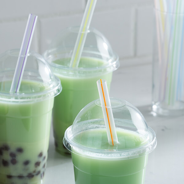 This straw's pointed tip is specifically designed for piercing through boba tea film. The strong plastic construction ensures it's up for the job and comes in an assortment of purple, green, yellow, orange, and blue striped colors that guests of all ages will love.