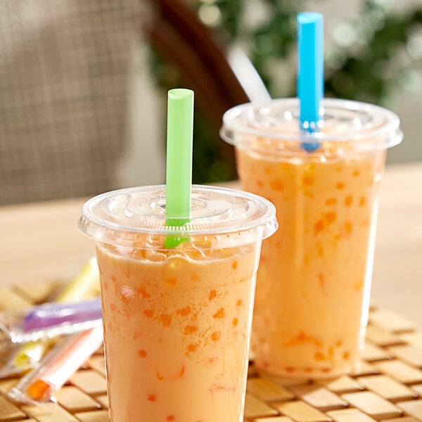 This Choice 7 3/4" neon extra wide pointed wrapped boba straw is perfect for boba teas and thicker beverages like smoothies, milkshakes, and slushies. The wide, pointed design accommodates small boba / tapioca pearls and other add-ins to create the specialty beverages your customers love.