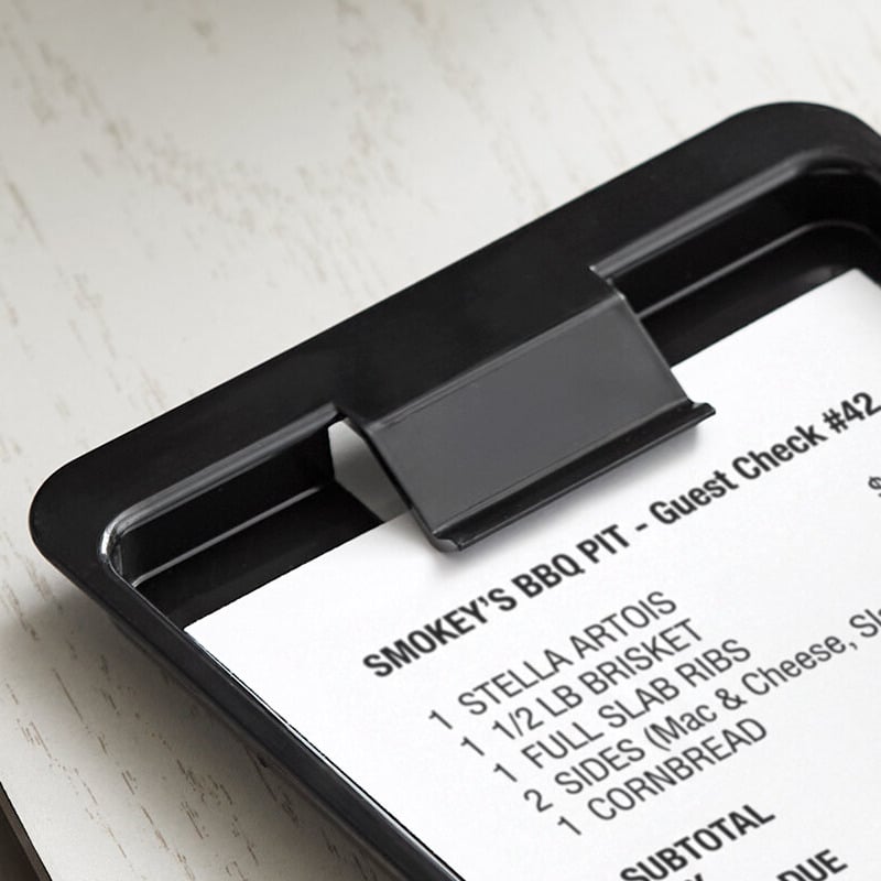 The added convenience of having a tray handy to carry to and from the register will be highly appreciated by your staff. This tray easily holds up to 18 checks at a time, and the clip at the top is perfect for keeping cash and credit cards protected during the transaction.
