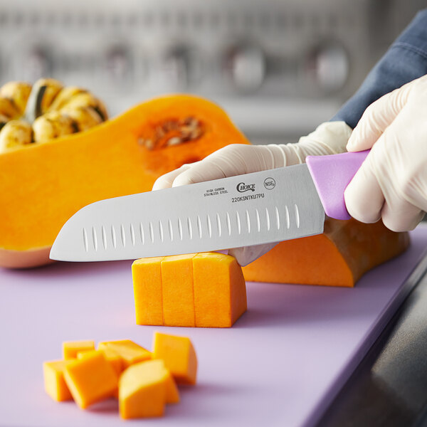 This versatile knife is perfect for slicing, dicing, mincing, or chopping anything from fruits and vegetables to meats and poultry. This makes it ideal for use at your restaurant, catered event, bistro, or cafe! Long-lasting, light, and affordable, this Choice knife is ideal for use in any high-volume commercial kitchen, as well as culinary schools and cafeterias. Part of a convenient color-code HACCP line, this knife has a purple colored handle that allows it to stand out and makes it great for creating a color-coded system in your kitchen to prevent cross-contamination.