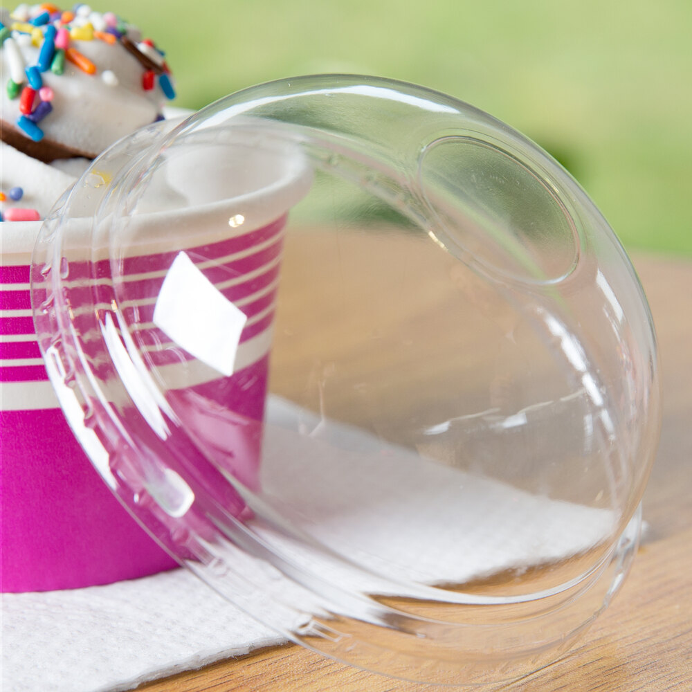 View All ItemsKeep your ice cream, frozen yogurt, and other decadent desserts covered with this Choice 8 / 12 oz. clear round dome lid.