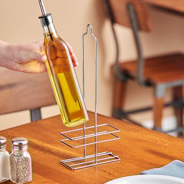 Display your cruets tableside with this Choice 8.5 oz. olive oil cruet rack! Serve your garlic-infused oil for dipping bread, house-made dressing for salads, or vinegar for crispy fries. This handy rack keeps cruets stored safely out of the way yet available for customers to use during service. It holds a pair of 8.5 oz. cruets, making it perfect for presenting oil and vinegar to your guests.