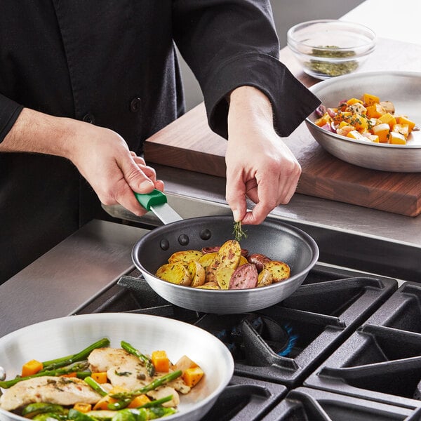 Made by choice great non-stick pan holds up to the wear and tear and washing of daily use my silicone grip handle would definitely recommend this pan we use plenty of them in the size in the kitchen