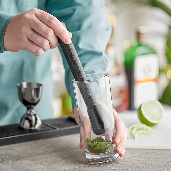 Release extraordinary fresh flavor combinations directly into your mixed drinks with this Choice 8" black smooth head muddler. A must-have for all bars, this muddler helps you craft various delectable drinks. Crush mint for mojitos, rosemary for whiskey, or fruit for fresh sangrias. This muddler's long length makes it ideal for taller mixing glasses, and the smooth head helps muddle ingredients with ease for fresher cocktails. Simply place your herbs or fruit in the bottom of your glass, add some simple syrup or alcohol, and use the head of this muddler to mash the products until their flavors are extracted into the perfect cocktail.