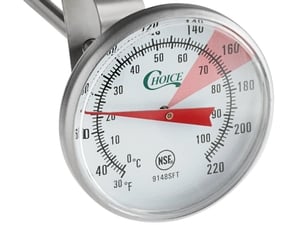 A 1 3/4" dial display lets you easily read temperatures from 30 - 220 degrees Fahrenheit and 0 - 104 degrees Celsius, with +/- 2 degrees of accuracy. The lens is made from polycarbonate to provide protection from drops and impacts.