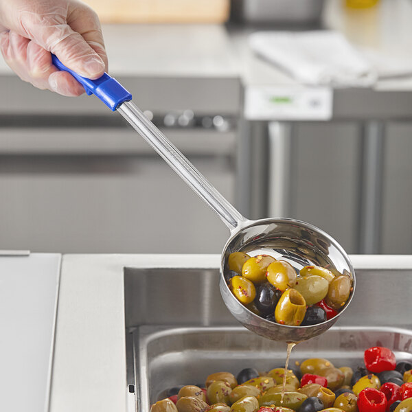 Details like the blue handle and stamped capacity number make it quick and easy to identify this portion spoon from others. A built-in stopper notch prevents the handle from sliding into food pans.