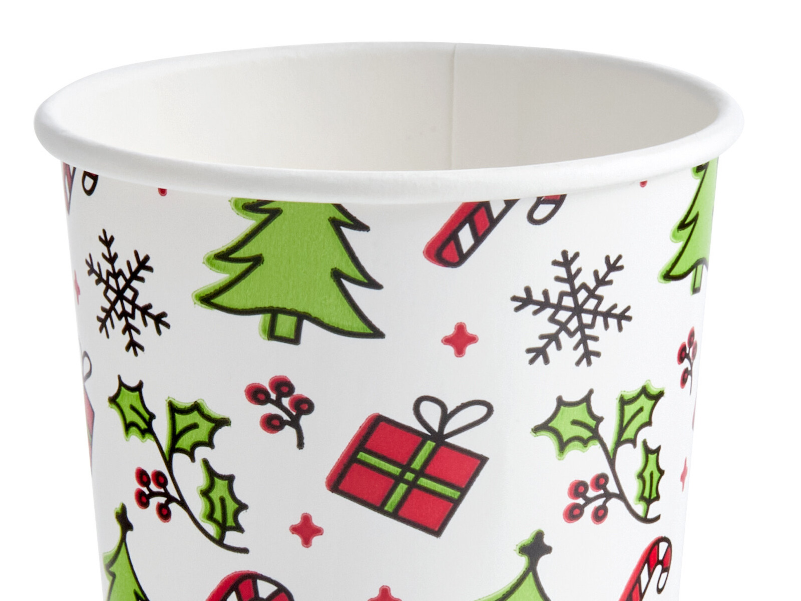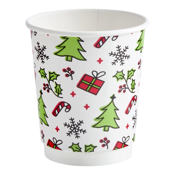 Both versatile and economical, this Choice hot coffee cup is the perfect beverage solution for your cafe, coffee shop, kiosk, concession stand, or convenience store. It features a Christmas design that will bring a touch of seasonal joy to your customers' beverages and has a space-saving construction, allowing it to be placed in a convenient cup dispenser for compact storage and easy accessibility.