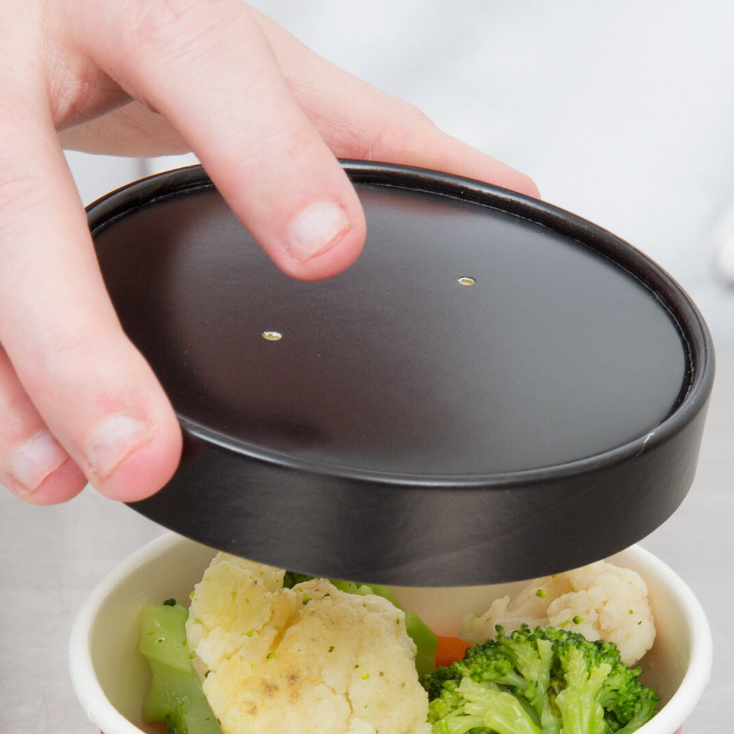 To avoid soggy product, this container and lid combo includes a vented paper lid that lets hot, moist air out, before it becomes stuck within the container. It is a rich, black color, for a clean presentation every time, and it's made of the same double poly-coated paperboard as the container, so you know it's both durable and moisture-resistant.