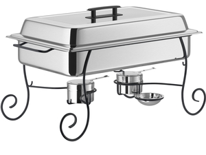 We already owned several of the full size chafers with black wrought iron stands, so we were delighted to find it in the half size and to order a few. The small hooks on the back legs that hold the lid when it's not in use are very helpful and demonstrate this company's attention to detail. This chafer is perfect for smaller events or for holding sauces that are served warm and the wrought iron details provide just enough of that rustic chic feel to elevate our pork from pit to party!